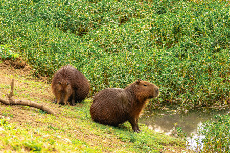 Capybaras ( hydrochoerus hydrochaeris ) standing relaxation in nature