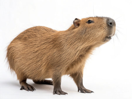 a brown capybara is standing on a white background looking up and to the right in a studio shot