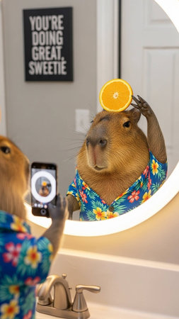 A capybara takes a selfie in a bathroom while wearing a Hawaiian shirt and balancing an orange on its head
