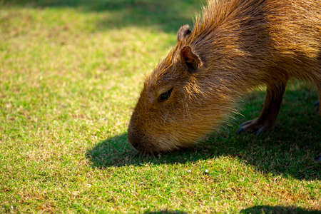 Capybara (Hydrochoerus hydrochaeris) grazing on fresh green grass