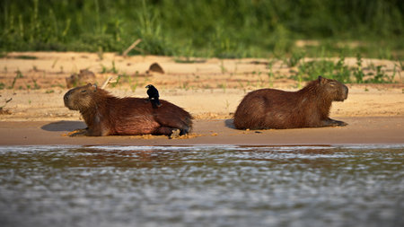 A closeup of capybaras lying on the shore of a lake in Pantanal, Brazil