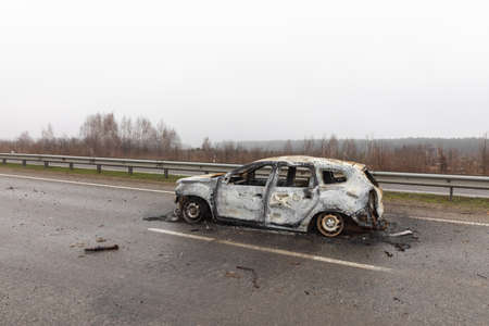 Completely burnt out and carbonized car. Vehicle blown up by military shell burned abandoned automobile during war operations. Copy ad text space