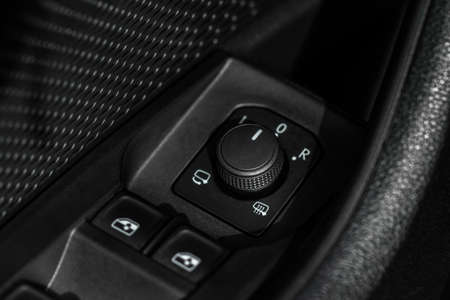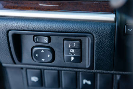 The buttons for controlling the mirrors electric drive on the center console of the instrument panel inside the car are of modern design in black with white signs and symbols.