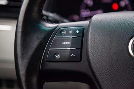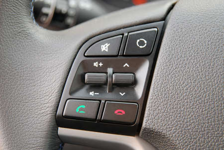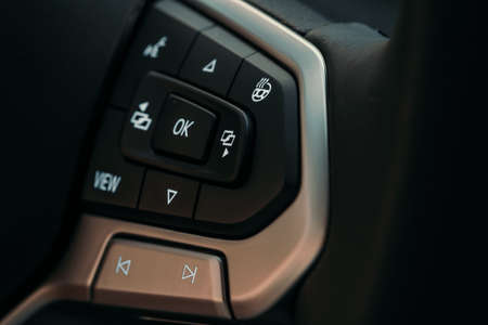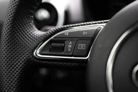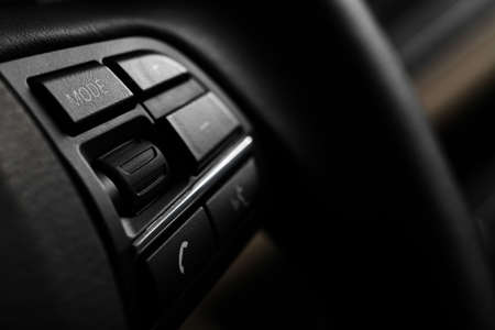 Multi-functions control buttons on modern steering wheel in new car, close up.