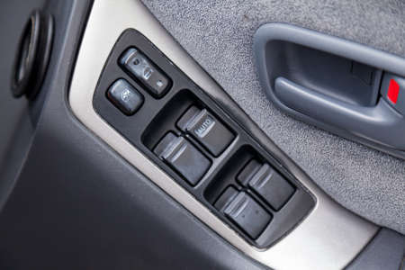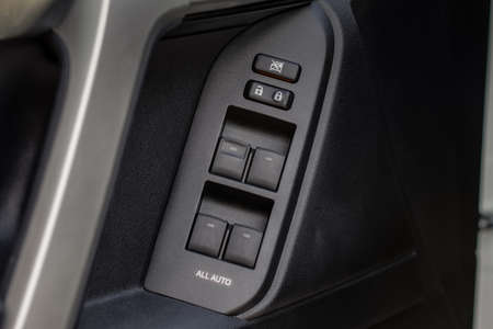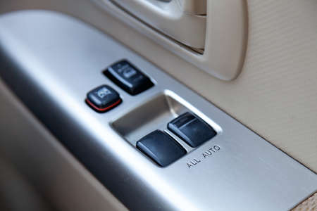 Close up view of button controlling window in modern car interior. Vehicle interior detail. Door handle with windows controls