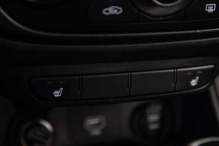 car interior details, modern buttons dashboard and panel. Chair heating, airbags options
