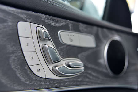Electric car seat adjustment control panel close up view. Adjustable car seat position buttons on the door. Car interior.