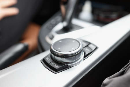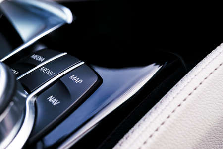 Closeup of a modern car interior with media and navigation control buttons