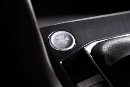 Novosibirsk, Russia - 12.19.2019: Button start and turn off the ignition of the car engine close-up on the dashboard, electric key, of modern design black and with element chrome on the interior panel