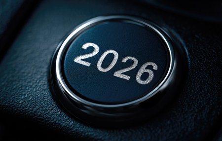 A detailed close-up shows a dark, circular button prominently displaying the year 2026. The button is illuminated by subtle lighting, creating a reflective surface and texture. The composition uses a shallow depth of field, set on a dark background. This image could be used for various commercial or editorial concepts.