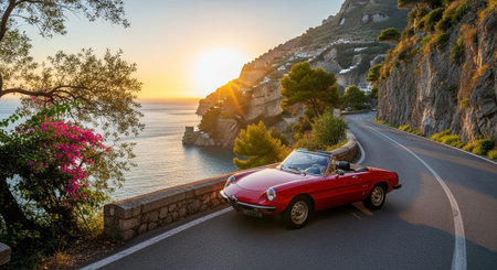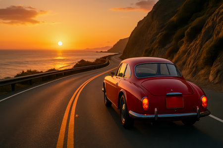 A classic red car navigating a winding coastal road during a beautiful sunset