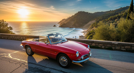 A vintage car parked on a winding coastal road overlooking the ocean, with a stunning sunset in the background creating a nostalgic scene. Resplendent.