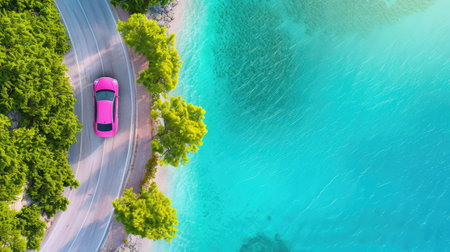 This stunning aerial view captures a pink car winding along a picturesque coastal road, bordered by vibrant trees and sparkling blue waters, embodying adventure.