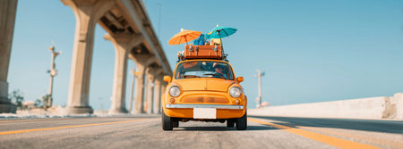 A vibrant yellow car adorned with umbrellas and luggage drives along a sunny road under a bridge.