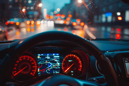 This image captures a close-up view of a car dashboard, showcasing illuminated gauges and warning indicators as the vehicle navigates through a city at night.