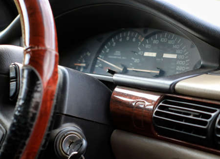 Car dashboard interior view. Car instrument panel with tachometer and speedometer. View from steering wheel to rpm gauge and speed meter. Car engine indicator. Closeup dashboard with auto light.