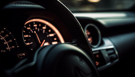 Illuminated car dashboard displaying speedometer and rpm gauge with orange accents, highlighting speed, engine performance, and automotive details in modern vehicle design