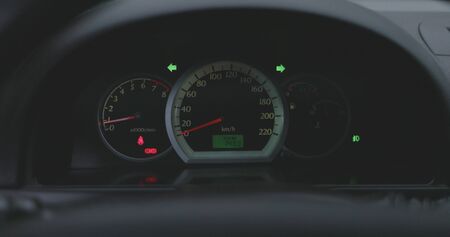 Close up shot of a speedometer in a car. Car dashboard. Dashboard details with indication lamps.Car instrument panel. Dashboard with speedometer, tachometer, odometer. Car detailing. Modern interior