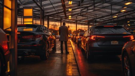 Queue of cars at customs control. Waiting to pass border control to access. Rear view of a man standing in front of cars in a parking lot.