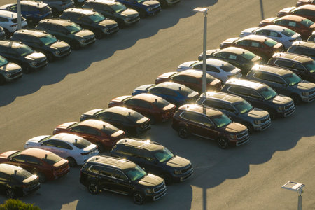 Large parking lot of local dealer with many brand new cars parked for sale. Development of american automotive industry and distribution of manufactured vehicles concept