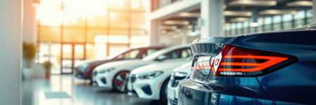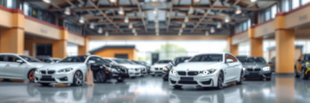 Car auto dealership. Themed blur background with bokeh effect. New cars at dealer showroom. Prestigious vehicles.