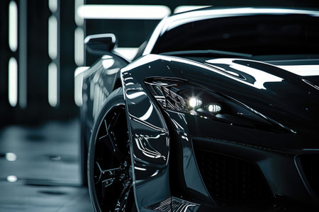 A stunning close-up of a sleek black sports car, showcasing its bright headlights and luxurious design. Perfect for automotive enthusiasts and modern vehicle lovers.