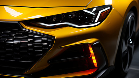 Close-up of the front headlight and wheel of a yellow modern car. Headlight on yellow car, front view, close up. Headlamps of a vehicle. Nobody, street photo