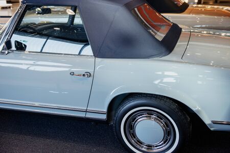 View of the drivers side of grey retro cabriolet car with wheel arch above a whitewall tire and chrome disc, window trim and mirror on brown floor.