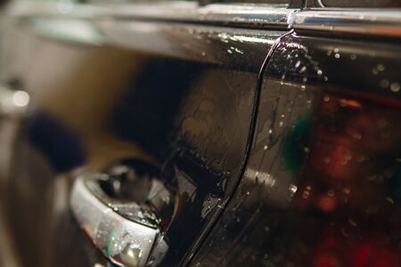 An employee of the car wash thoroughly washes conducts detaling and applies protective equipment to the body of an expensive car