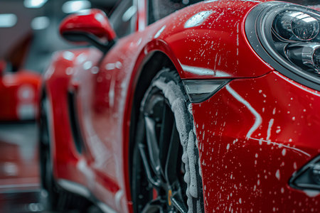 Shiny luxury sports car covered in foam at a car wash, symbolizing cleanliness, care, and automotive detailing.