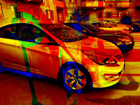 Stylized color photography of passenger cars. Parking of vehicles at a residential building. Close-up art photography.