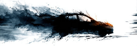 Black oil creates the silhouette of a car, capturing the essence of speed and movement in an abstract, artistic interpretation of automotive design.