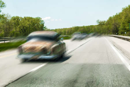Retro car on the road with motion blur background.