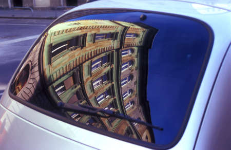 Old building facade reflecting in car window