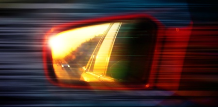 abstract illustration with car mirror in sunset over the highway