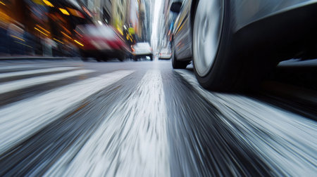 Captivating image showcasing a moving car on a busy city street, highlighting the energy and speed of urban life through vibrant motion blur effects.