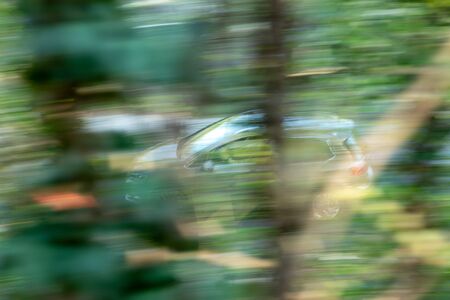 panning shot of a car photographed through trees