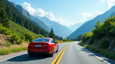 A vibrant red car cruises down a scenic, winding road surrounded by towering mountains and lush greenery on a beautifully clear day, showing nature's breathtaking landscape.