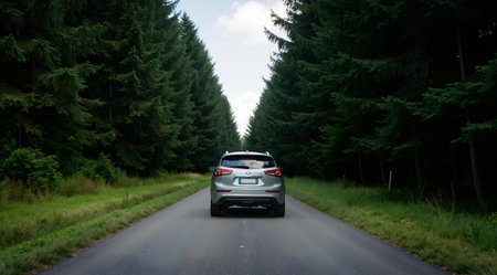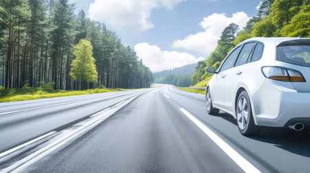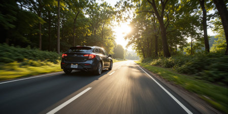 A hybrid car driving through a lush forest road in the early morning, sunlight filtering through the trees, symbolizing harmony between technology