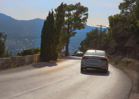 Car illuminated by sunlight moves on bend in the road against background of mountains