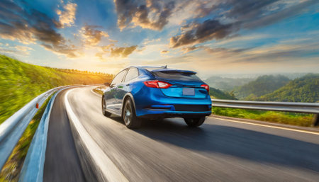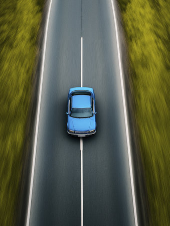 Blue car drives on highway, captured from top view, showcasing its sleek design and surrounding blurred landscape. image conveys sense of speed and motion