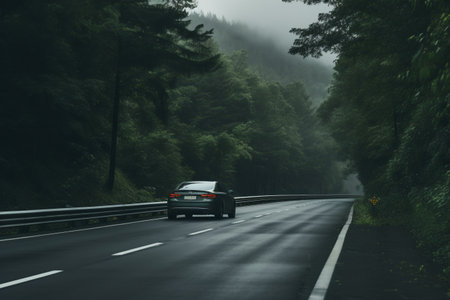 Moody black and white landscape with dark storm clouds, forest, car and road out of horizon. Beautiful nature background and wallpaper