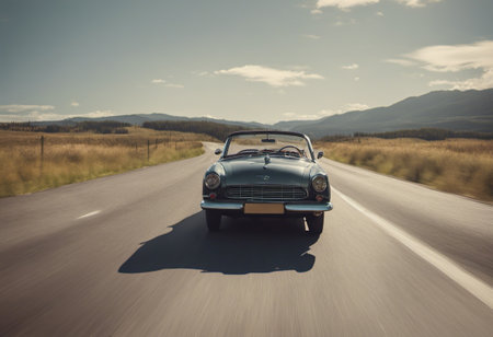 High-speed perspective of a sports car racing on a highway in the mountains during a sunny afternoon