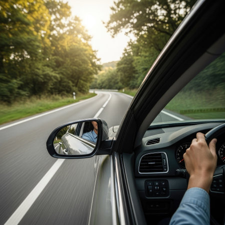 An individual drives a vehicle down a curving road lined with trees. The scene shows the car's interior, side mirror, and exterior environment. Warm sunlight filters through the trees, casting a bright atmosphere. Suitable for use in various editorial or commercial projects.