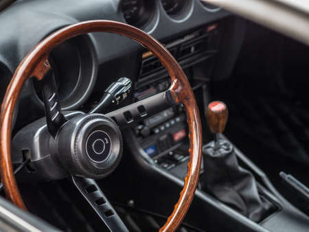 Car interior, steering wheel and speedometer