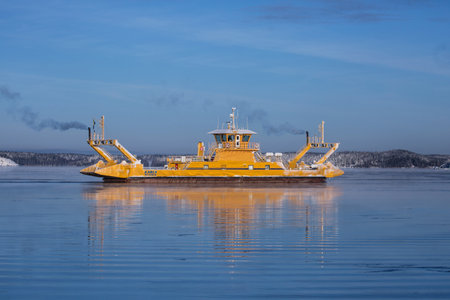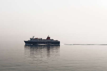 On of the large car ferries moving in the foggy Stockholm archipelago with some snow on the deck, Sweden