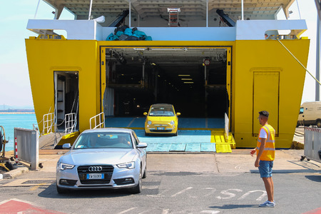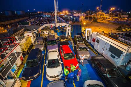 Piombino, Italy - June 30, 2015: Unloading vehicles from ferry boat Corsica Express in the seaport