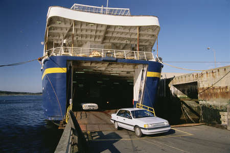 Norwegian car ferry landing at port. Open barrier. Horizontal