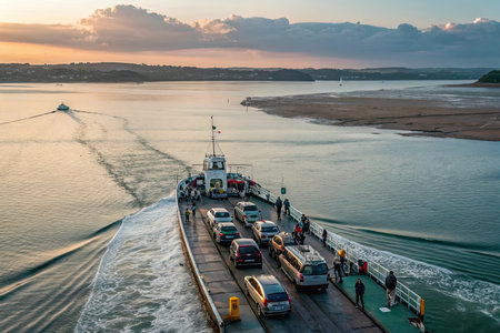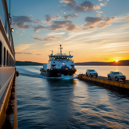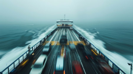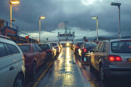 Cars lined up on a ferry deck at dusk under rain, with reflections on the wet surface. Generative AI