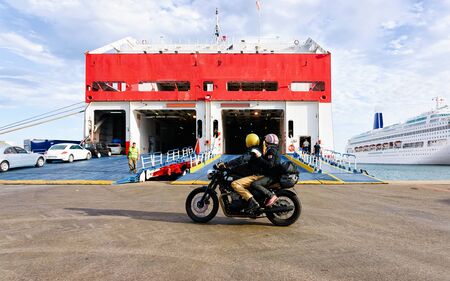 Motorcycle driving at Ferry bridge in the port in Cagliari in Sardinia, Italy. Scooter with motorcyclists.